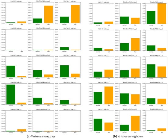 Inter-day (a) and intra-day (b) variance in features (inactivity (Inact), movement scale (MovSca), and movement speed (MovSp)) across fasting and non-fasting days for participants P1–P5, showing the variation among days and variation within days (among hours).