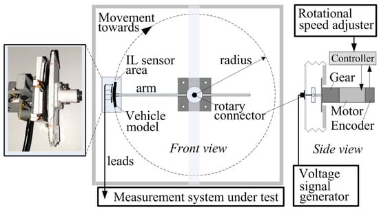 The LTB generates measurement signals that correspond to those obtained from the RTB, while also considering the modeled EMI produced by the operation of the vehicle’s engine. The vehicle model follows a circular trajectory with a fixed radius. The drive system, which is mounted internally, consists of a motor, planetary gear, an encoder, and a programmable controller. This controller regulates the rotational speed based on data received from the encoder, see Figure 2. The software for the controller allows for the rotation of the arm at a specified rotational speed and for a predetermined number of laps. At the end of the arm, a vehicle model is mounted which is described in detail in the next section. A rotary connector mounted in the motor axis supplies the voltage signal from the generator to the moving vehicle model’s EMI coil. The design parameters of the LTB are listed in Table 1. The vehicle and the IL sensors models are made in the scale 1:50 relative to the real dimensions.