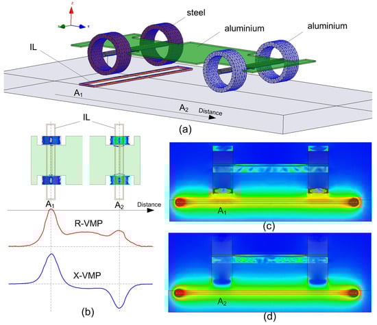 Figure 4a presents a sample-developed numerical model of the IL sensor and a simplified car chassis, designed in the ANSYS Maxwell 3D environment. This model was used to investigate the obtained R-VMP and X-VMP waveforms (Figure 4b), depending on whether the car’s rim is made of steel or aluminum. Electromagnetic field distributions were calculated for various distances between the vehicle and the sensor (Figure 4c,d).
