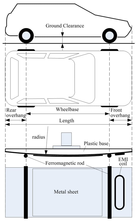 The plastic base of the vehicle chassis model was made using 3D printing technology. A rectangular sheet of 1 mm thick aluminum with dimensions proportional to the dimensions of the vehicle as seen from the top was attached to the base. In order to map the shape of the signals obtained from the IL sensors into the space between the axles, a second layer of a smaller sheet of the same thickness was added. To make wheel artifacts visible in the VMPs, ferromagnetic wire rods with a diameter of 2 mm were installed in place of the axles. An EMI coil was mounted in the front part of the model. The terminals of the EMI coil were brought out to the stationary part through a rotary joint. The EMI coil can be powered by a laboratory voltage signal generator. This makes it possible to carry out tests on the system for measuring vehicle parameters in motion in the presence of the EMI interference that arises during the operation of a real vehicle engine.