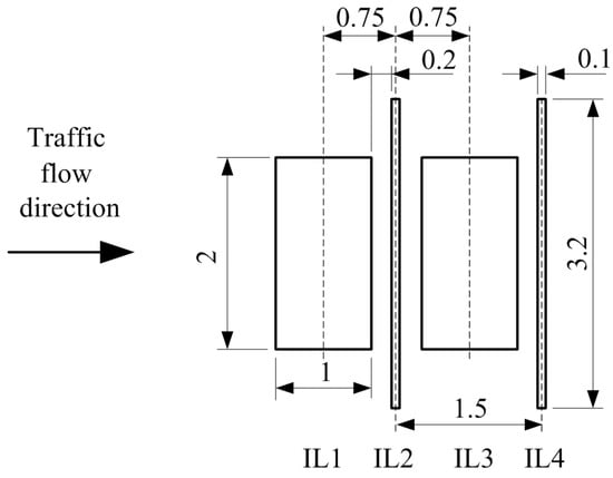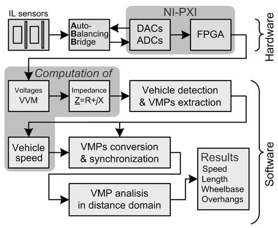 The RTB measurement system contains four IL sensors, see Figure 6, mounted in the road as follows: two wide IL sensors (with dimensions 1 m by 2 m), and two slim IL sensors (with dimensions 0.1 m by 3.2 m) arranged alternately starting from the wide IL sensor [21,23]. Wide IL sensors provide a sufficiently high sensitivity for vehicle detection and enable accurate speed measurement and reliable registration of full (not cropped) VMPs. Wide IL sensors are also used for the vehicle body length estimation. Slim IL sensors are used to detect the axle, to measure the wheelbase, and for overhang estimation. The measurement system block diagram is shown in Figure 7.