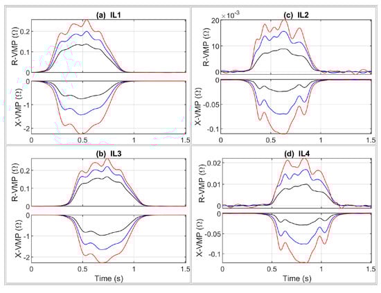 Exemplary extracted VMPs of a passenger car (Toyota RAV4), where R-, and X- means resistance and reactance VMP, respectively. Red, blue, and black VMPs were obtained at the highest, middle, and lowest frequencies, respectively.