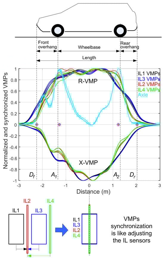 The VMP analysis in the distance domain leads to the detection of artifact locations originating from the vehicle front, rear, and axles. The detection of the front and the rear is carried out in order to measure the vehicle’s length. The location of the axles in the body of the vehicle allows us to measure the distance between the axles and the front and rear overhangs. Axle detection employs an Algorithm 1 that enhances the axle information by combining R-VMP and X-VMP obtained from the slim IL sensors [14].