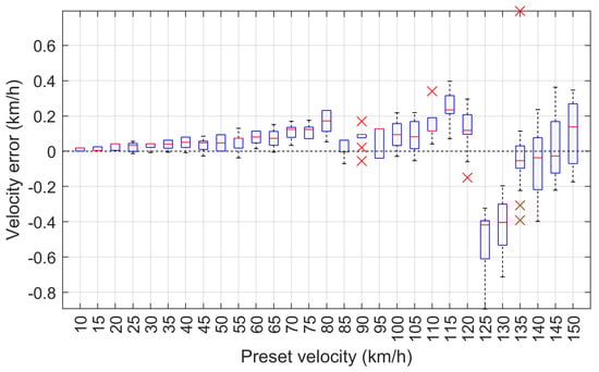 Speed errors for each measurement, computed as the difference between the speed measured by the MFIM system and the preset speed are shown in Figure 12 in the form of a box plot [39]. On each box, the central red mark indicates the median, and the bottom and the top edges of the box indicate the 25th and 75th percentiles, respectively. The whiskers extend to the most extreme data points that are not considered outliers, and the outliers are plotted individually using the red × symbol. The outliers were identified using the MATLAB boxplot function based on the interquartile range (IQR) method.