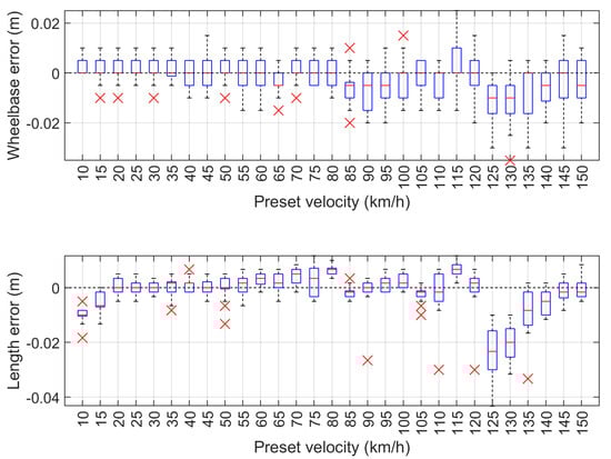 Measurement test results for wheelbase error (top) and vehicle length error (bottom) dependent on the preset speed.