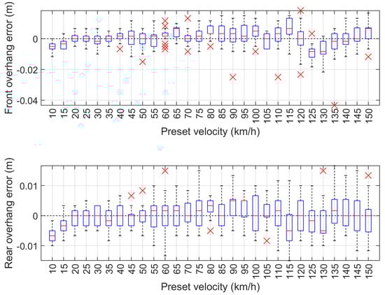 The measurement results of the wheelbase error and vehicle length error dependent on the preset speed are shown in Figure 13. The values of the front and rear overhang error of the vehicle model in dependence on the preset speed are shown in Figure 14.