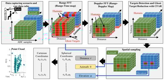 Figure 2 illustrates the point cloud generation framework from the raw data captured for a two-person scenario. The RDC is passed through a Fast Fourier Transform (FFT) computation block in a horizontal direction along the ADC samples. This FFT is often termed as range-FFT [43,44], and the peaks in range-FFT define the distance (r) of targets as illustrated in Figure 2. Next, another FFT (Doppler-FFT) is performed along the number of chirps in a frame, which yields the velocity (v) of the target. The Doppler-FFT requires the transmission of multiple chirps within a single frame.
