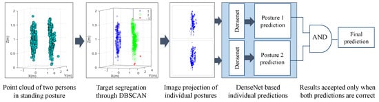 Figure 3 briefly illustrates the methodology to separate the two human targets using DBSCAN. In non-overlapping cases, clusters and are designated as human 1 and human 2, respectively, and processed individually. The two postures are transformed into images, and a deep learning algorithm is applied individually to both the images. The two predictions are passed through an AND logic, where the overall prediction is considered as correct only if both the postures are detected correctly.