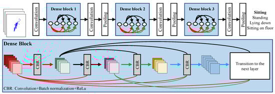 As stated earlier, non-linearly structured convolutional networks have emerged as a promising solution in image recognition problems. In this study, several machine learning architectures were evaluated for radar-based posture recognition work, and the best performing architecture was adopted. The deep learning architecture considered in this study is shown in Figure 4. Along with convolution and pooling layers, the network comprises a complex block termed as a dense block, where all the dense block inputs and intermediate outputs are connected to form a dense connection. Each dense block perpetuates the same process, as illustrated in Figure 4. Subsequently, feature diversity is achieved for enhanced performance. Our network consists of three dense blocks for feature learning, followed by classification.