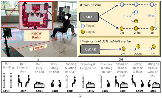 For data collection, we used mmWave radar, named MMWCAS-RF-EVM, manufactured by Texas Instruments (Dallas, TX, USA). This radar consisted of 12 transmitting and 16 receiving antennas. A total of 192 receiving channels were formed using TDM-MIMO, out of which 86 channels corresponded to the azimuth antenna array, and 4 channels corresponded to the elevation array. The parameters for configuration are presented in Table 2. A frame rate of 20 frames per second (FPS) was selected, while the total capture time for a single data sample was set to 1 s. One of the data capturing scenarios is depicted in Figure 5a, showing two participants sitting with 33% overlap in front of FMCW radar at a distance of approximately 2 m. As illustrated in Figure 5b, to confirm the robustness of proposed framework, the data were captured both in overlap and non-overlap scenarios. The resulting posture combinations for the two non-overlapping human case scenarios are illustrated in Figure 5c. Note that a single scenario was marked as correct recognition only if both the postures were classified correctly.