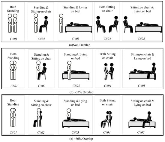The designed experimental setup is shown in Figure 6a–c. In the first case, although both participants were visible to radar, they were in close proximity, as shown in Figure 5b. For the second and third cases, one of the participants was completely visible to the radar, while overlapping approximately one-third (33%) and two-thirds (66%) of the other participant, respectively. The posture combinations for these three cases are depicted in Figure 6. For the combined non-overlap and overlap cases, 900 images were collected in total.