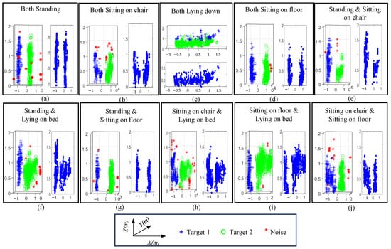 Point cloud of all the ten posture combinations: (a) Both standing, (b) both sitting, (c) both lying down, (d) both sitting on floor (e) standing and sitting, (f) standing and lying down (g) standing and sitting on floor, (h) sitting and lying down, (i) sitting on floor and lying down, and (j) sitting on chair and lying down.