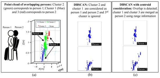 Radar point cloud for two overlapping human participants in standing and sitting on chair positions: (a) data collection environment and extracted point cloud, (b) raw DBSCAN, and (c) centroid-based overlap detection.