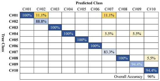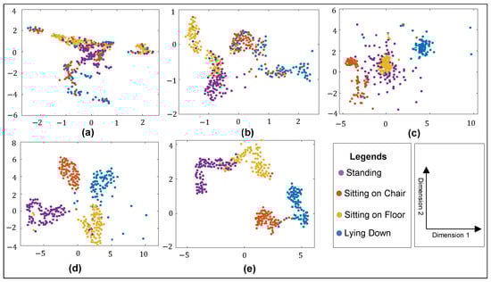 The t-distributed stochastic neighbor embedding (t-SNE) analysis is a frequently used dimensionality reduction technique to visualize the complex dataset using low dimensional space. Prior to the accuracy evaluation of the opted deep learning model, features visualization at the end of the learned network can be performed to visualize the features distribution in lower dimensions. The performance of different networks in lower dimensions using t-SNE analysis is presented in Figure 9a–e, which illustrates that the inter-class separation for the learned features of ShuffleNet and DenseNet is higher than the other networks. Within these two networks, inter-class separation for DenseNet based features was the highest.