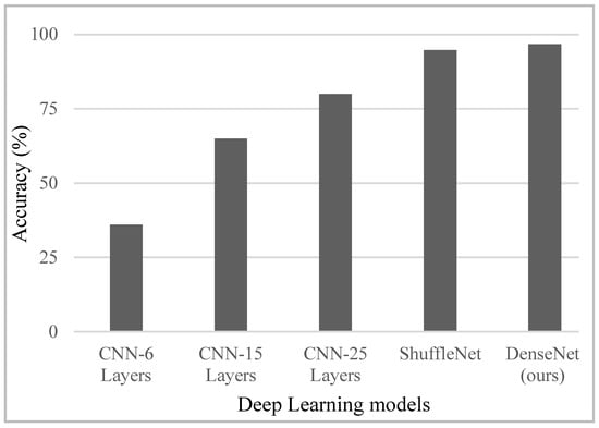 As stated earlier, the existing works often consider a single human target for posture evaluation [28,29,30,31,34]. Due to a lack of target segregation mechanism in the related studies, a direct comparison with the existing works cannot be performed. Nevertheless, in order to verify the effectiveness of the proposed framework based on target segregation followed by the DenseNet model, we compared several deep learning architectures on the generated dataset. Prominent convolution-based deep learning models were evaluated against the ten posture combinations shown earlier in Figure 5. The classification accuracy for each network is reported in Figure 11. A CNN comprising of 6, 15, and 25 layers resulted in 40%, 69%, and 73% accuracy, respectively. Note that in the two-human scenarios, the posture of both the participants must be correct. Another deep learning architecture named ShuffleNet [40] was also considered for evaluation, which yielded 90% classification accuracy. Contrary to this, DenseNet achieved 96% accuracy.