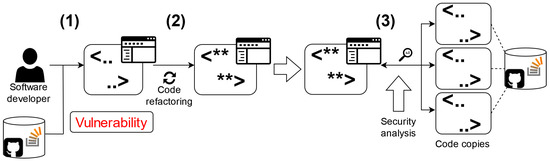 Figure 1 demonstrates one of the possible scenarios for using code clone detection. In stage 1, a developer creates IoT device software using an available code database (open repository, Internet resource, code library, etc.), or, in the case of proprietary development, a corporate code base. The original source may contain an IoT software vulnerability. In the process of development, the code is refactored. It is modified for adaptation to target use conditions (stage 2). The functional abilities of the cloned code do not change, and the clone-caused vulnerability stays in the code. Then, a binary is built. While making it, the debug symbols are lost, and the grammar of the binary code replaces the grammar of the source code. In this stage, the code syntax changes, but its semantics remain the same. During the execution of the binary, a clone-caused vulnerability may run in the IoT device. Special security analysis is required to detect this vulnerability. Security analysts utilize special detection tools to search for and classify similar code fragments containing clone-caused vulnerabilities (stage 3).