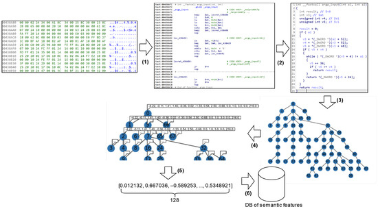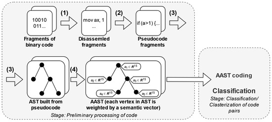 The compared code fragments are namely functions. Initially, the functions are disassembled (stage 1 in Figure 4) and decompiled (stage 2). Based on the recovered code, a traditional abstract syntax tree (AST) of each fragment is constructed (stage 3). As a novelty, all nodes of the common AST are proposed to be labeled by semantic attribute vectors (stage 4). The suggested structure is called an attributed AST (AAST).