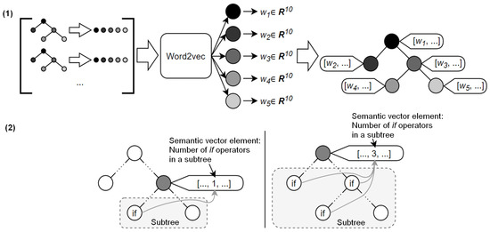 The scheme for constructing a semantic attribute vector for the AAST node is shown in Figure 5. Figure 5 demonstrates the examples of operator if for a non-terminal node and the root of the tree. In this figure, stage 1 depicts building a Word2vec vector of dimension 10. This stage involves the transformation of the AST into a sequence of node types, training of the model, and mapping each node to its attribute vector as a result of the training. Stage 2 in Figure 5 extends regular AST construction to include the building of elements for the semantic attribute vector of each node, which are computed as the sums of the number of elements of a specific type in the subtree.