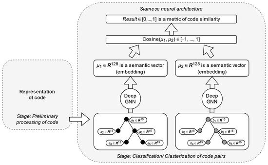 The method considered in [7] is chosen to implement the classification stage. Each AAST obtained in the preliminary processing stage is encoded into a semantic vector using a graph neural network (GNN) via the structure2vec vector representation method [32]. The original GNN model is replaced with a deep learning GNN (deep GNN) with three neural layers. Two instances of deep GNN are combined into a Siamese neural network. This allows the neural network to be trained to generate semantic vectors and compare pairs of vectors in every training epoch, implementing supervised learning. The diagram of the designed method is shown in Figure 6.