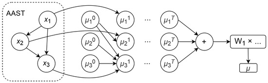 The mapping is implemented using a fully connected neural network, onto which a mask corresponding to the topology of the next AST is imposed at each step [7]. The use of this type of neural network allows the influence of the graph vertex attribute (semantic context) to be extended to the vertices incident to it. This ensures compliance with the tree topology. For each AST vertex, its own embedding is constructed, which is then summed by every instance. The embedding of the vertex v at step is specified by the following formulas: