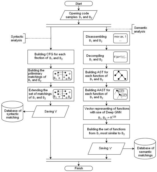 Summarizing the related works, a hypothesis is proposed regarding the need for a novel hybrid syntactic–semantic method to accurately detect semantic clones. It is suggested that syntactic similarity between code samples (e.g., vulnerable code and tested code) be analyzed at the binary code level to optimize overall efficiency and performance. This approach can help reduce the rate of incorrectly matched code samples. At a higher level, the method involves using an attributed AST and a dual deep graph neural network to process semantic features. The specifications of this method and its experimental study are presented in the following subsections.