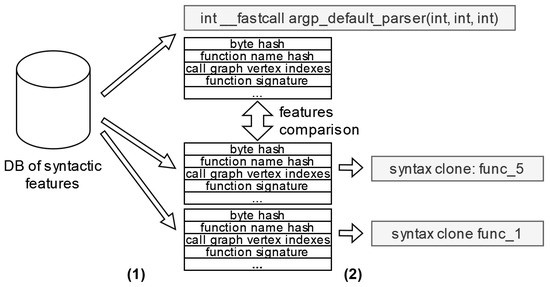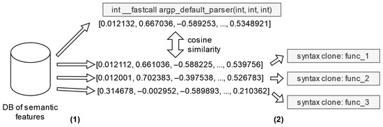 The method proposed in [29] allows searching for borrowed software components in the firmware of IoT devices. This method also uses low-level syntactic features based on the analysis of the assembler code of basic blocks, as well as high-level feature matching. Based on [7], this method also constructs an ACFG and then constructs semantic vectors to determine the similarity of the corresponding code fragments.