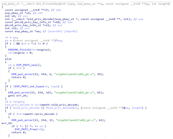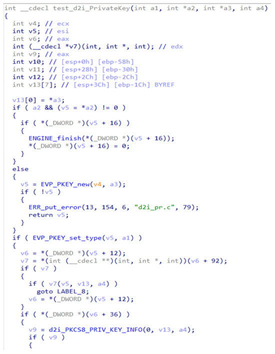 For the ablation study, test input was taken from the binaries presented in Table 3. For example, samples of the restored code for one function taken from different executable files are presented in Figure 13 (taken from libcrypto.so.1.0.0, developed for the IoT platform on a Linux system with MIPS architecture) and Figure 14 (taken from libcrypto-1_1.dll, developed for the PC platform on an MS Windows system with x86 architecture). It is a single function that performs the same operation but has a different code representation due to code reuse. For more efficient software production, this function implementation is cloned from PC implementation of the library to IoT implementation of the same library. In the same manner, clone-caused vulnerabilities are transferred from one software type to another. The test aimed to evaluate the detection of semantic clones using different variants of syntactic and semantic analyses and to determine whether the IoT code was cloned.