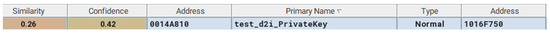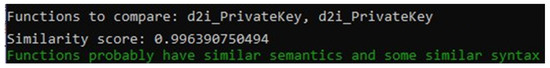 The BinDiff utility (syntactic-only analysis) demonstrated the output as presented in the screenshot in Figure 15. BinDiff showed a similarity score of 0.26, i.e., BinDiff did not detect the cloned code. The output of our method (syntactic–semantic analysis) is presented in Figure 16—the proposed method showed a similarity score of 0.996. To completely demonstrate the usefulness of a syntactic–semantic symbiosis, the semantic part of our method stayed active while the syntactic one was switched off. The syntactic-only case showed a similarity score of 0.89. All scores obtained for different syntactic and semantic combinations are summarized in Table 4. This ablation study provides compelling evidence that the syntactic–semantic approach is indeed effective.