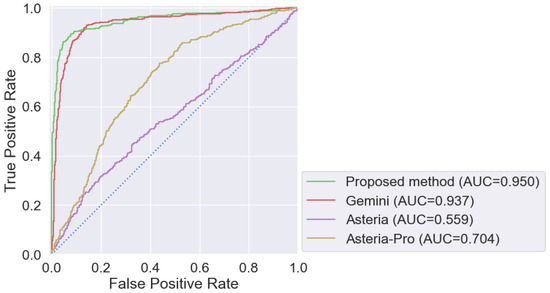 The implementations of these methods were tested using the same dataset (Table 2). For Gemini, the model was trained using the parameters proposed by the authors in [38]. For Asteria and Asteria-Pro utilities, a trained model proposed by the authors in [39] was applied. The ROC (receiver operating characteristic) curves were plotted as a result of this comparative experiment. The obtained ROC curves and the corresponding areas under the ROC curves (AUC scores) are presented in Figure 17. Values for quality metrics (the commonly used recall, precision, and F1 metrics) collected during the experiment are presented in Table 5.