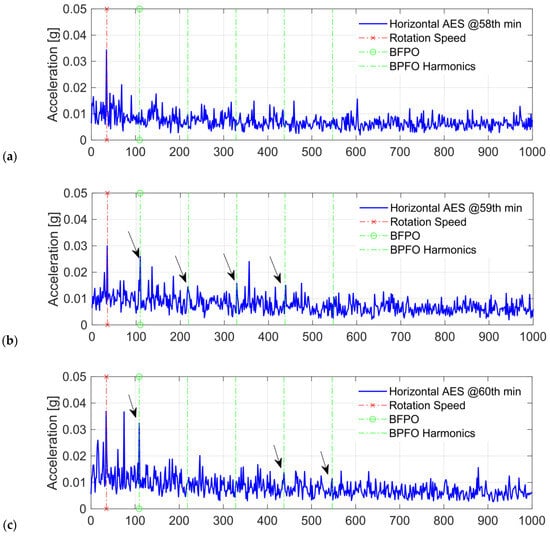 First, the AES for the two-channel acceleration measurements is computed to detect early-stage faults, which helps identify FDT and the bearing degradation stage. The segmentation length used for the AES is with the overlap rate providing 200 segments for averaging. The vibration signals of the test bearing ‘Bearing 1–3’ are shown in Figure 5. Due to the hydraulic loading direction, vibration accelerations from the horizontal channel have relatively higher amplitude. Based on envelope analysis, informative defect frequencies can be demodulated from the cyclic bearing resonance responses, which is known as resonance demodulation. From the envelope spectrum, bearing defects can be detected by identifying distinct frequency peaks and modulation patterns matching bearing FCFs and their harmonics. According to the bearing dimensions and the operating speed, the theoretical BPFO for Bearing 1–3 is 107.91 Hz [17]. By spectral inspection of the AES for all the experimental operation time, BPFO and its harmonics can be identified from the horizontal AES after the 59th minute, indicating that the outer-race fault has developed since this time. This can be confirmed by the continuous appearance of BPFO harmonics in the horizontal AES from Figure 6b–d, except Figure 6a.