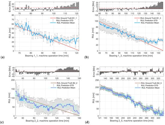 The results show that the CVAER model captures the decreasing trend in the predicted RUL since the FDT. The mean RUL predictions (in blue solid lines) closely follow the RUL of ground-truth (in red solid lines). The bar plot on the top of the prediction is given by the difference between the mean prediction against the RUL of ground-truth, wherein a positive error represents an over-prediction while a negative error indicates an under- or conservative prediction of RUL. For example, as in Figure 9a, accurate RUL predictions are obtained for Bearing 1–1 at the initial degradation stage since the 66th minute, with the average prediction error at 6.22 min (denoted by a red dashed line). Specifically, at the 70th minute, the bearing RUL predicted by the CVAER is 53 min, which is the same as the ground-truth RUL of Bearing 1–1. This suggests that the proposed model could provide accurate RUL estimations directly from the averaged envelope spectra given the measured vibration signals. Other examples including Bearing 1–3, Bearing 2–5, and Bearing 3–4 also show accurate RUL predictions at the vicinity of FDT, which indicates the effectiveness of RUL prediction by the proposed method even at the early stage of bearing faults.