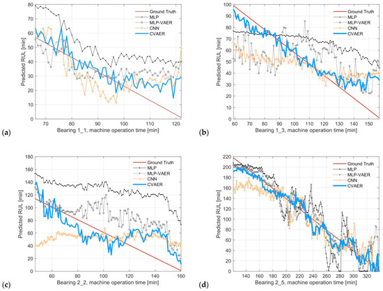 It is observed that the CVAER outperforms other benchmarks in capturing a decreasing trend in the predicted RUL, which closely follows the RUL of ground-truth. Take the result of Bearing 1–1 in Figure 11a as an example, the predicted RUL using MLP deviates from the ground-truth by an over-prediction of about 20 min, while the MLP-VAER model improves the prediction performance and obtains accurate estimates around the 73rd and the 90th minute during the experiment. This improvement indicates the benefit of the VAER model for performing regression tasks while learning a disentangled latent distribution conditioned on the target variable, which aligns with the conclusion obtained by the previous research [26]. In Figure 11a, the CNN takes two-channel AES input and provides better predictions than the MLP, especially at the early stage of the experiment around the 73rd minute. For the proposed CVAER model, the RUL prediction performance at the early degradation stage is further improved.