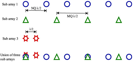 The concept of SCASS is based on the fundamental architecture of SCA proposed in [12] and reproduced in Figure 1 for the reader’s convenience. SCA comprises three subarrays (SAs) known as SA1, SA2, and SA3, having PM, PN, and Q elements with inter-element spacing QN/2, QM/2, and /2, respectively. Here, P, M, N, and Q are integers, and M and N are coprime. Physically, it is a single linear array of elements, spaced non-uniformly, as depicted at the bottom of Figure 1. However, its elements are grouped into three, just for beamforming, so that three different beampatterns can be generated. It is noteworthy here that there is only one element common in the three subarrays. On the other hand, in SAs 1 and 2, there are P elements common. This is a sample arrangement of SCA with a specific combination of ; however, other combinations have also been considered in this paper, as mentioned in Section 3.2. In SCA, the three subarrays are beam-steered towards , which is the desired steering angle of the whole array. On the contrary, in SCASS, a modified version of SCA, the three subarrays are beam-steered towards + , and , respectively, where is the desired steering angle of the whole array and is an adjustable parameter to control the deviation of steering angles of SAs 1 and 2. The overall beam pattern of SCASS is given by