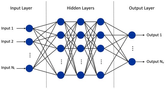 An artificial neural network (ANN) is a machine-learning model inspired by the human brain that can be trained to perform tasks such as classification and regression [31]. Similar to a human brain, an ANN consists of a network of neurons where each neuron receives multiple inputs and generates an output that may act as one of the inputs to other neurons. An artificial neuron is a mathematical function that calculates the weighted sum of the inputs and adds an offset, also known as bias. Then, it passes the calculated sum to a function, mostly non-linear, usually known as an activation function. An ANN is comprised of an input layer of neurons, an output layer, and one or more hidden layers between them [32], as shown in Figure 3. The number of neurons in the input layer is equal to the inputs (Ni), whereas the number of neurons in the output layer is equal to the number of outputs (No). In general, the output of nth neuron in mth layer is expressed mathematically as follows: