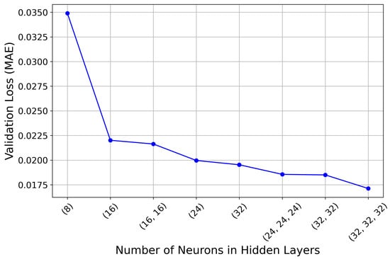 Choosing the architecture of the neural network for a specific application is an iterative process with different combinations of hyperparameters. Generally, a complex mapping of the inputs to the outputs may require a deeper or wider network relative to a simple mapping. It is often necessary to fit a shallow neural network due to its low time and space complexity, whereas deep neural networks have their own set of challenges, such as exploding and vanishing gradients, high computational complexity, training instability, and overfitting [34]. Therefore, it is advisable to begin with a simpler network and gradually increase the complexity while trying a range of hyperparameters like learning rate, regularization coefficients, batch size, etc. After that, a network with the best trade-off between performance and complexity is chosen. In this work, the performance of the network with different numbers of layers and numbers of neurons per layer is depicted in Figure 4. This figure shows that ANN with 3 hidden layers and 32 neurons per layer performed the best, while the ANN with a single hidden layer and 8 neurons per layer performed the worst. However, other ANNs with 1 and 2 hidden layers and 16, 24, and 32 neurons per layer performed slightly poorer than the best one. Now, the selection of the network model depends on whether performance is optimized or the computational cost. If it is desirable to minimize the computational cost with reasonable performance, then the ANN with 1 hidden layer and 16 neurons per layer, known as ANN1, is the best option. However, other specifications of the two networks are shown in Table 3.