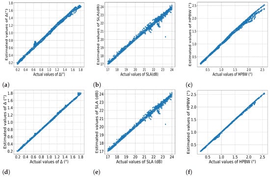 The ANN-estimated values of , SLA, and HPBW have been plotted versus their actual values in Figure 5 for comparison. It is obvious from the figure that the ground truth and the estimated values are more or less the same. The performance of the two networks, in terms of mean absolute error of the three estimated parameters, is also shown in Table 5. The results show that the largest mean absolute error offered by ANNs 1 and 2 are 1.82% and 0.83%, respectively. It is noteworthy here that the proposed ANNs can suggest optimum and SLA only for the reasonable PSLR input values. If the desired PSLR is beyond the capability of SCASS, the ANN-suggested values of and SLA may not guarantee the desired performance. The maximum PSLR that SCASS can offer depends on the array parameters and steering angle, as is obvious from Figure 2. An increase in SLA means more suppression of sidelobes, but it does not necessarily mean increased PSLR. In fact, PSLR increases with an increase in SLA up to a certain limit, which depends on array architectural parameters as well as on and . For all the combinations of , considered in this work, the highest achievable PSLR is 23.5 dB, which is quite reasonably high for most of the applications. However, higher PSLR is accompanied by a widened beam, i.e., the increased value of minimum possible HPBW.