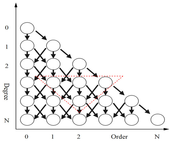 In the actual calculation, we found that there were some values which needed to be repeated in each calculation of coefficients. If we would repeat these values in every calculation, then this would greatly affect the computational efficiency and resources. For this reason, we simplified the calculation of coefficients in Equations (13)–(15) for the recursive method between every other order and degree as follows: