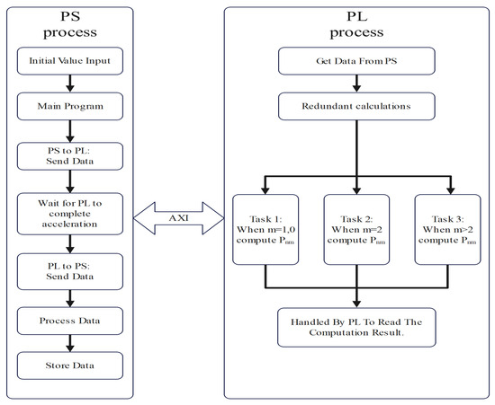 This study was based on the Vivado 2021.2 development environment on an AX7020 development board using Xilinx’s XC7Z020-2CLG484I (Xilinx, San Jose, CA, USA) as the FPGA master chip. The number of computationally relevant intermediates grew exponentially as the order of the fnALF increased. Therefore, it was unrealistic to implement all computations and storage on a pure FPGA. We considered the resource limitation issue. It is well known that the Zynq-7020 core fuses programmable logic (PL) with a high-performance ARM processor core (PS), and thus it was possible to fully utilize the parallel processing power and highly programmable nature of the PL part of the FPGA to enhance the computational efficiency, and the PS was utilized for the rest of the operations. As shown in Figure 2, we implemented our algorithm in two parts based on the properties of ZYNQ.