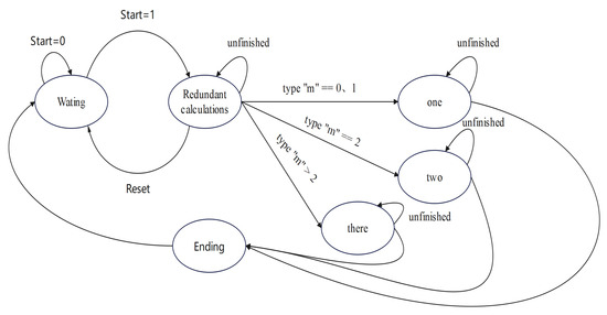 The whole computational module was idle after power-up, and when the initial value reached the new layer added above, it was subjected to redundant calculations. After the redundant calculations were completed, the three calculation tasks corresponding to circles 1, 3, and 4 in Figure 3 began. When the three computational tasks were completed, the “type” information was carried to the subsequent PS side. The PS side then selected the correct calculation results. This operation was repeated until we calculated the degree that we needed.