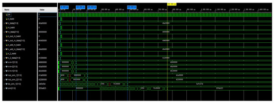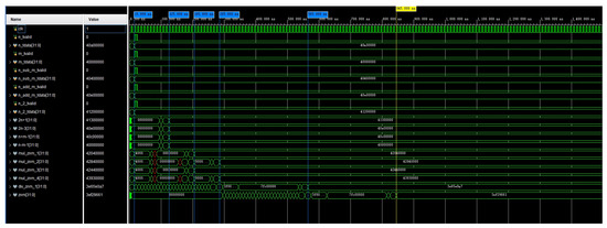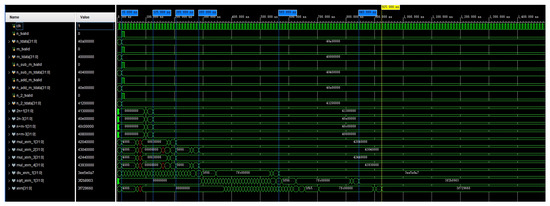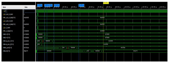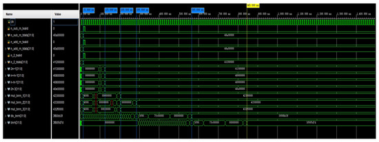 The simulation of the computed waveform of the coefficient is shown in Figure 7. In the optimized calculation, n_sub_m_tdata, n_add_m_tdata, and n_2_tdata were used as the initial input values for the calculation. In the figure, is named . The signals named in the figure beginning with mul and div are multiplication and division operations of , respectively, and they include the calculation of four intermediate quantities. The waveform simulation results show that when using four adders or subtractors, the operation was completed in 125 ns. Once these intermediate quantities were computed, the computation of began and was completed in 925 ns. This completed the calculation of Equation (21). In this way, parallel computation on the FPGA took 905 ns, and if full serial computation was used, then it took 1400 ns.