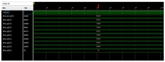 The simulation of the computed waveform of the coefficient is shown in Figure 5. In the optimized calculation, n_sub_m_tdata, n_add_m_tdata, and n_2_tdata were used as the initial input values for the calculation. The signals named in the figure beginning with mul and div are multiplication and division operations on , respectively, and they include the calculation of four intermediate quantities. The waveform simulation results show that when using four adders or subtractors, the operation was completed in 125 ns. Once the intermediate quantities were computed, the computation of began and was completed in 845 ns. This completed the calculation of Equation (19). In this way, parallel computation on the FPGA took 830 ns, and if full serial computation was used, then it took 1240 ns.