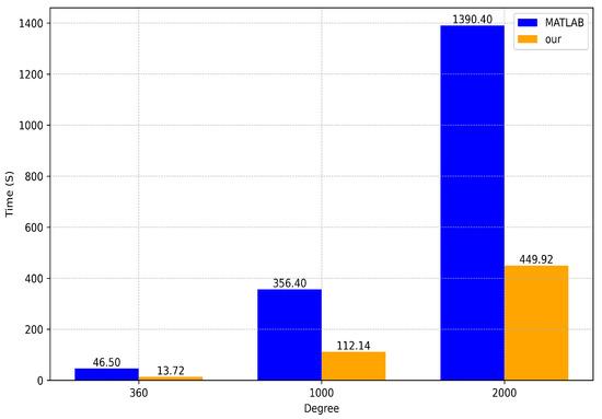 The FPGA-based implementation of the cross-order recursive algorithm in our design had a significant advantage in terms of time consumption over the implementation on the MATLAB platform using matrix operations. When n = 360, our computational efficiency was 3.38× higher than when using MATLAB. When n = 1000, our computational efficiency was 3.17× higher than that when using MATLAB. When n = 2000, our computational efficiency was 3.09× higher than when using MATLAB. The average computational efficiency improvement when using the FPGA rather than MATLAB was more than threefold higher.