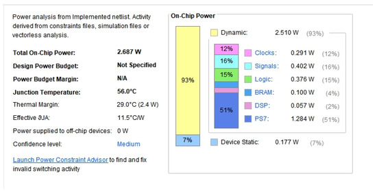 According to the power consumption analysis using Vivado 2021.2, as shown in Figure 11, the total on-chip power consumption of this design was estimated to be 2.687 W, while our actual measurement was 2.9 W, both of which are significantly lower than the power consumption of using a computer.