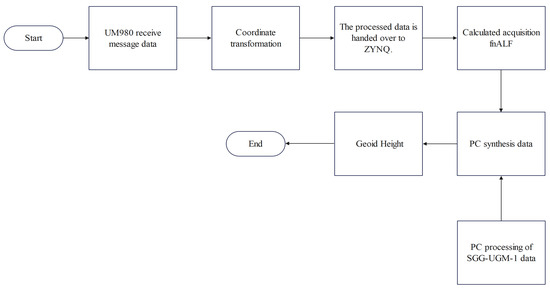To calculate the geoid height in the Earth’s gravitational field, we needed to obtain the longitude and latitude coordinates of the experimental points from UM980. However, the original latitude and longitude coordinates obtained cannot be directly used for calculation; they need to undergo the coordinate transformation process in Figure 13 to obtain the new coordinate information. The new coordinate information was used to provide the initial values for calculating the required fnALF values in ZYNQ. Subsequently, we obtained the relevant coefficients for each degree from the SGG-UGM-1 model and combined both to derive the geoid height.