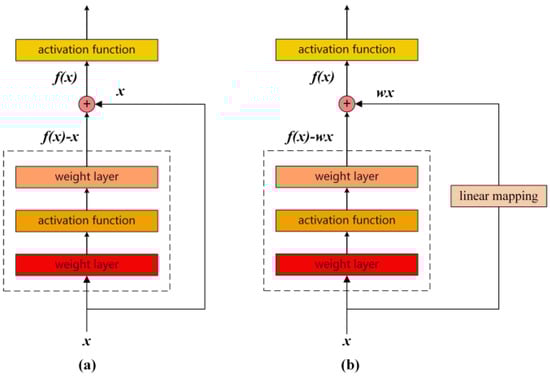 To address the problem of network degradation due to increasing network depth, He et al. [33] proposed a residual network. A residual network introduces shortcut connections by adding the input directly to the output of each residual block, thereby facilitating cross-layer information propagation. The architectures of the residual block are shown in Figure 1.