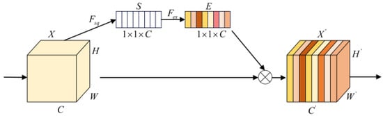 Squeeze-and-Excitation Networks (SENet) are one of the most classical attention mechanisms and consists of two parts, Squeeze and Excitation. The Squeeze part compresses the features using a global average pool (GAP) to obtain statistical features, , for each channel. The Excitation part excites the statistical features through a fully connected network to produce a set of weight coefficients, . The structure is shown in Figure 2. The formulas of the above processes are as follows: