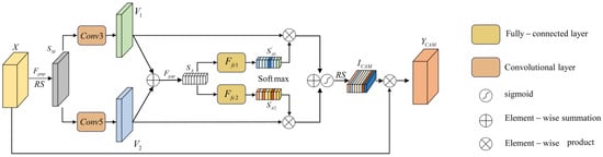 By fusing multiscale features, networks can effectively utilize information from various scales to create a more comprehensive feature representation. Li et al. [34] proposed Selective Kernel Networks (SKNet), which incorporate a dynamic selection mechanism, allowing these networks to automatically choose different convolutional kernels based on the characteristics of input data, achieving more flexible and efficient feature extraction. The structure of SKNet is shown in Figure 4.