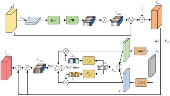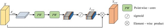 First, to avoid information loss, two layers of point-wise convolutions with the same channel dimension are used to capture the importance of channels. Then, the attention feature map is processed by the Sigmoid function to obtain the weight . Finally, the output of the IAM, , is obtained by multiplying with the input feature map. Assuming that the input feature map of the module is X, the above process can be expressed as follows: