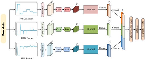 The constructed attention module is embedded into a 1DCNN to propose an MA-MS1DCNN. The 1DCNN was selected because the signals collected by the sensors are time-series data represented as one-dimensional structures, which are suitable for input to a 1DCNN. In addition, a 2DCNN typically needs to convert one-dimensional sensor signals (e.g., via wavelet transform and Fourier transform). However, in this conversion process, the sequence and period information of the original signal may be lost. The 1DCNN also has a smaller number of parameters, which facilitates effective real-time diagnosis compared to the 2DCNN. For example, the input layer of the 2DCNN in [13] was 224 × 224 × 3. The MA-MS1DCNN comprises a feature extraction layer, a feature fusion layer, and a fault classification layer, and its overall structure is shown in Figure 8.