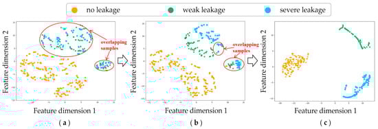 To gain an intuitive understanding of the impact of the attention mechanism on the fault diagnosis of hydraulic systems, we selected a hydraulic pump as the analysis subject and employed t-SNE [35] to visualize the feature output at different stages of the model. First, we input the test data to the trained model and extracted feature maps from the various stages of the output. Then, the extracted high-dimensional feature maps were mapped to a 2D plane using t-SNE, where the features were represented as points within a 2D coordinate system. Finally, a scatter plot was generated based on these coordinates. To verify the effectiveness of the HAM, this paper selectively extracts three kinds of features: the features learned by the feature extractor, the features optimized by the HAM, and the features learned by the classification. As shown in Figure 10, after feature extraction, the fault samples with severe leakage were nearly completely separated from the other types of samples, and significant overlap between the samples with weak leakage and no leakage can be observed. After recalibrating the channel weights using the proposed attention mechanism, the number of overlapping samples was reduced significantly, which indicates that introducing the attention mechanism can significantly improve the fault identification performance. The results of the final classifier are shown in Figure 10c. As can be seen, three types of fault samples are completely separated, the clustering boundary is clear, and there is no overlapping phenomenon. These results indicate that the proposed fault diagnosis framework can effectively realize accurate diagnosis of the hydraulic system.